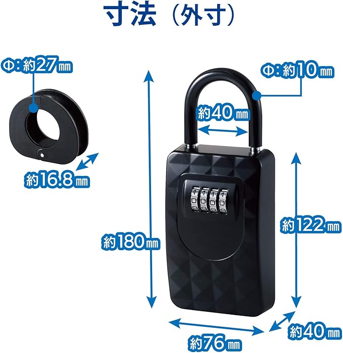 ■ 寸法:セキュリティキーボックス:約幅76 奥行40 高さ180mm(ツル幅約40mm、ツル経約10mm)、ハンドル用樹脂パーツ:(ツル幅約27mm 厚み約16.8mm)