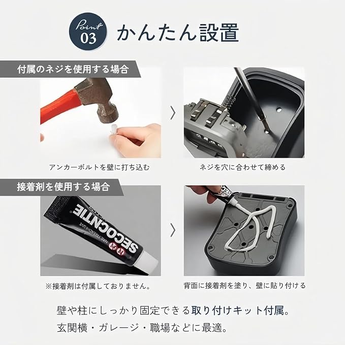 【設置簡単】 壁や柱にしっかり固定できる取り付けキット付属。玄関横・ガレージ・職場などに最適。