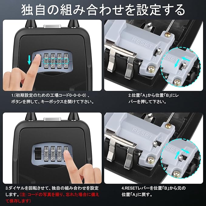 【4桁の組み合わせデザイン】このキー金庫は4桁の数字の組み合わせで、自由で覚えやすく、簡単にリセットできます。このキー金庫は最大10,000通りの組み合わせが可能で、パーソナライズされたパスワードを設定できます