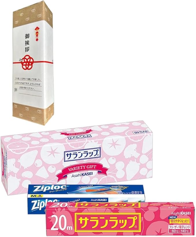 セット内容: 旭化成サランラップ22cm 20m 1本、ジップロックフリーザーバッグM5枚 1個、オリジナル熨斗包装紙、白無地ビニール袋付き
