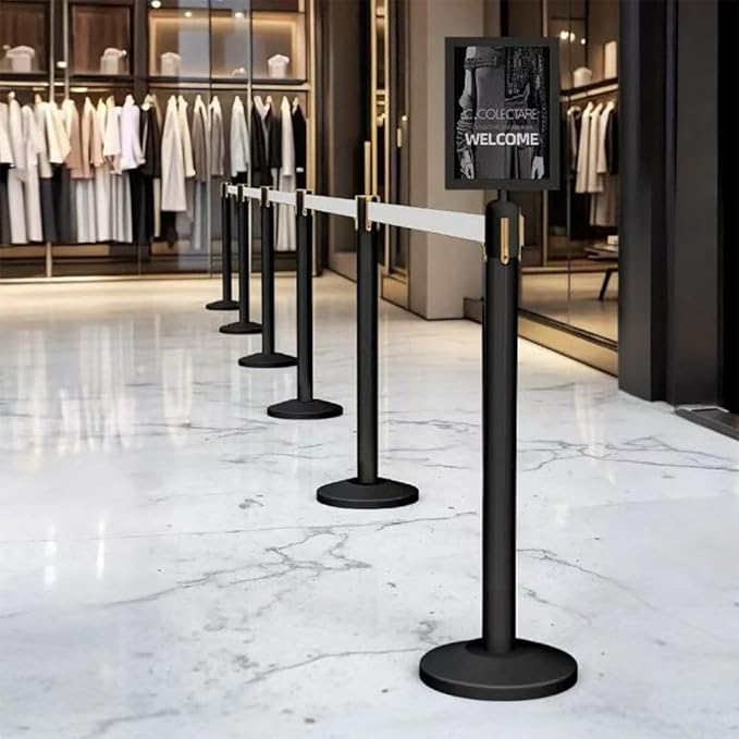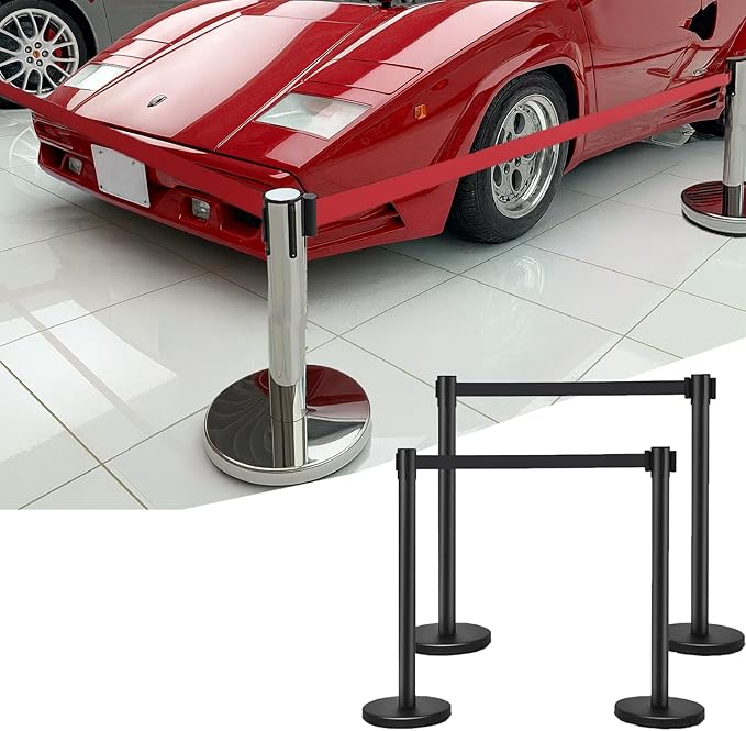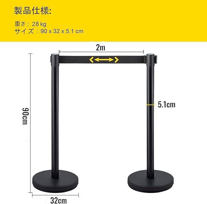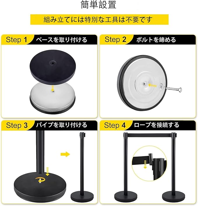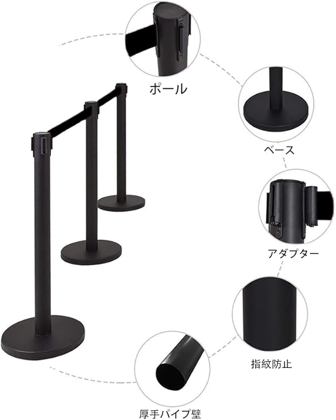 【カスタマイズ自在な4ベルト連結システム】:4本セットのベルトを前後左右に自由に連結可能。混雑時の人流整理、エリア分け、展示ブースの仕切りなど、様々なシチュエーションに柔軟に対応。単体でも複数連結でも使い勝手抜群で、効率的な空間管理を実現します。