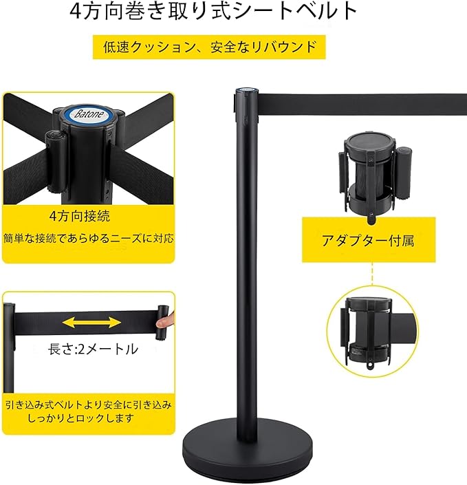 Batone ベルトパーテーション 4本セット4方向連結 移動が便利です 人員整理 自動巻取りポールパーテーション ブラックポールxブラックベルトベルト長さ約2m 支柱 ベルトパーテーション 行列の整理や誘導に大活躍 駐車場ポール(ブラックポール)
