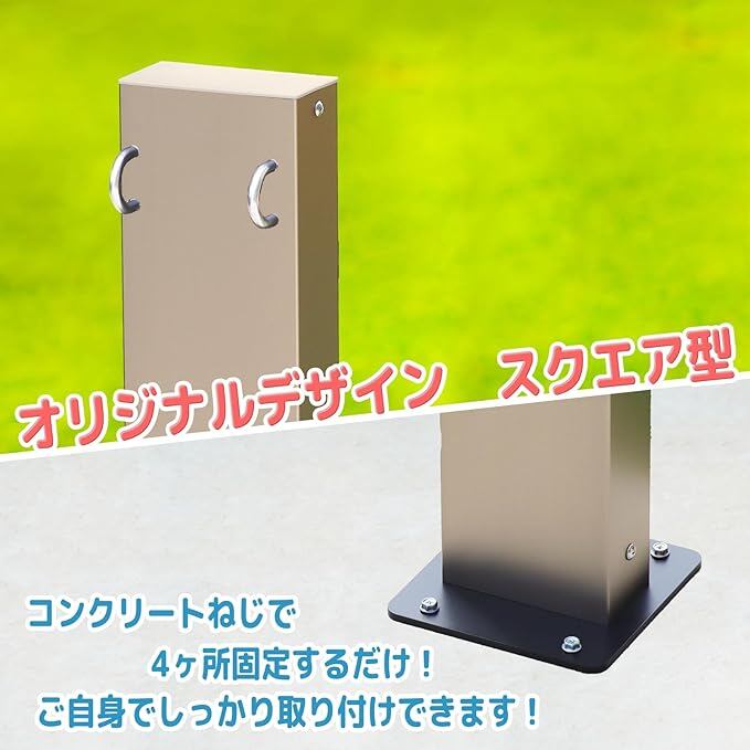【取り付け方法】 ベース部分を附属のコンクリートねじで地面に固定して使用します。コンクリートねじで固定するめ設置後の取り付け取り外しが簡単です。