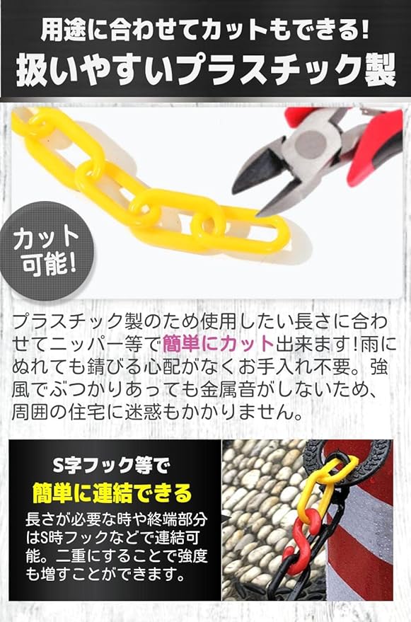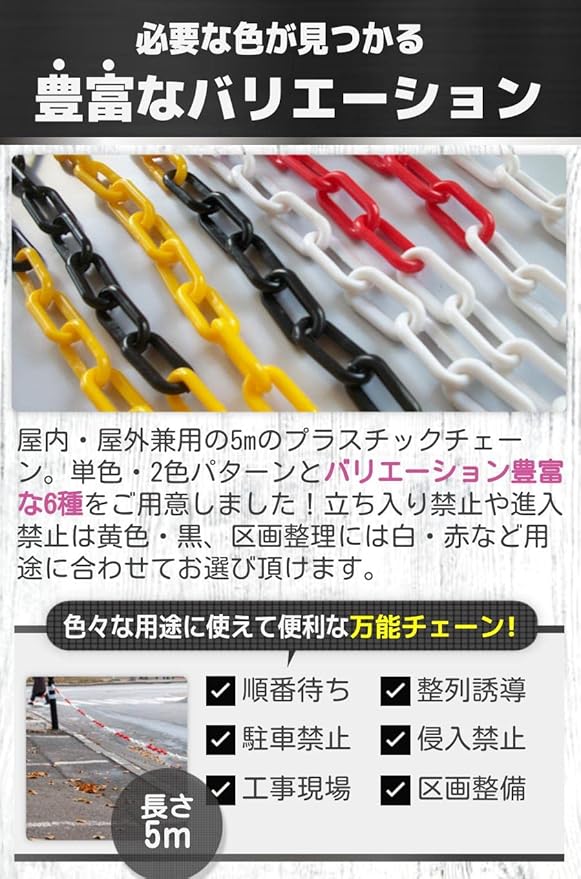 【豊富なバリエーション】屋内・屋外兼用の5mのプラスチックチェーン。単色・2色パターンとバリエーション豊富な6種をご用意しました!立ち入り禁止や進入禁止は黄色・黒、区画整理には白・赤など用途に合わせてお選び頂けます。