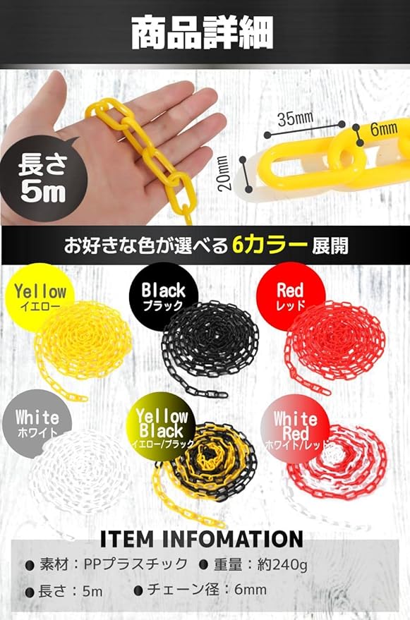 【商品詳細】 素材:PPプラスチック 重量:約240g チェーン径:6mm 長さ:5m