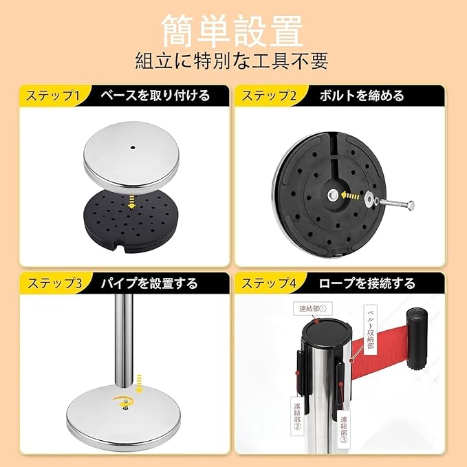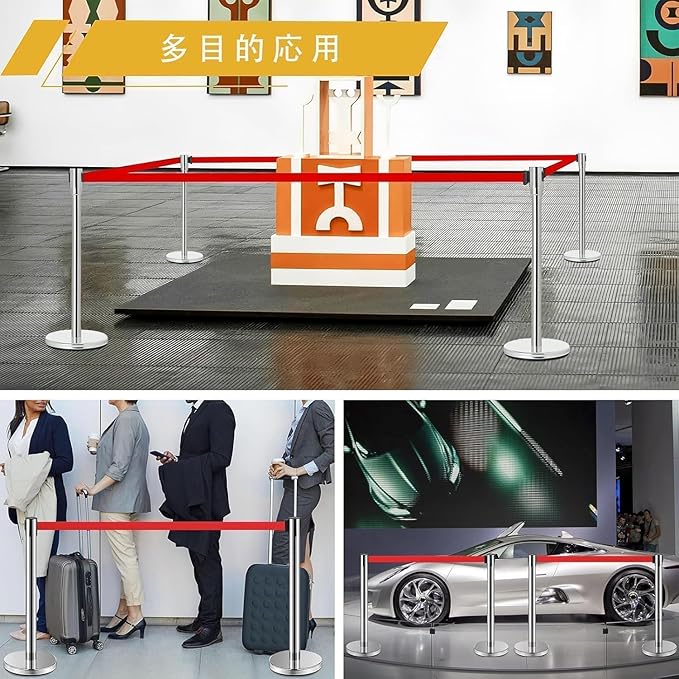 【カスタマイズ自在な4ベルト連結システム】:4本セットのベルトを前後左右に自由に連結可能。混雑時の人流整理、エリア分け、展示ブースの仕切りなど、様々なシチュエーションに柔軟に対応。単体でも複数連結でも使い勝手抜群で、効率的な空間管理を実現します。