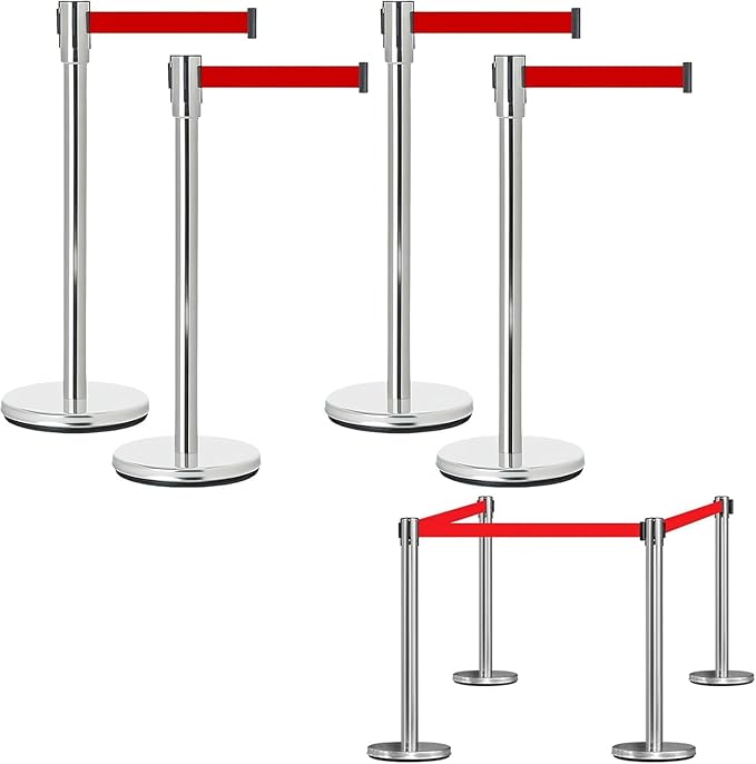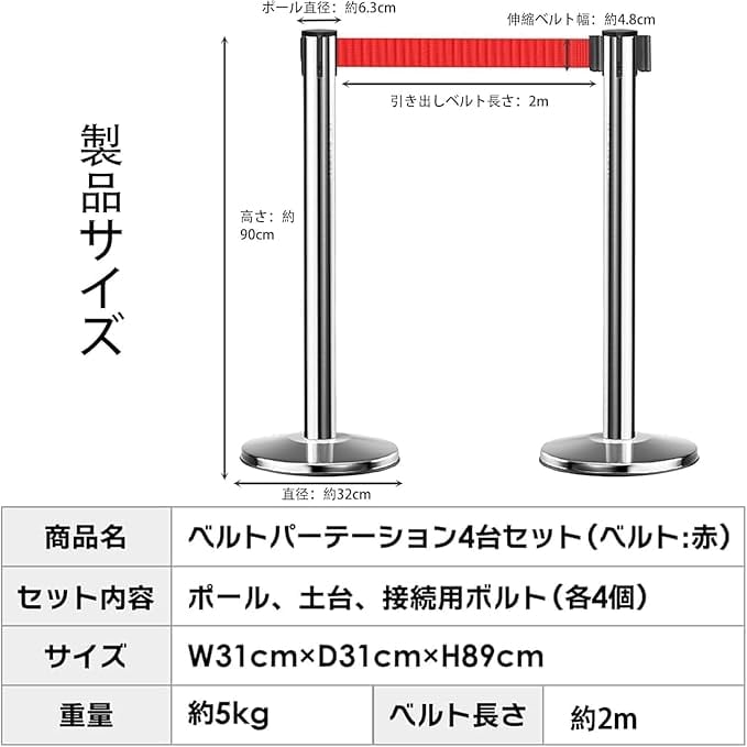 ベルトパーテーション 4本セット 4方向連結 移動が便利です 自動巻取りポールパーテーション シルバーポールxレッドベルトベルト長さ約2m 支柱 ベルトパーテーション 行列の整理や誘導に大活躍 店舗の列整理、空港の通路、イベントの入口