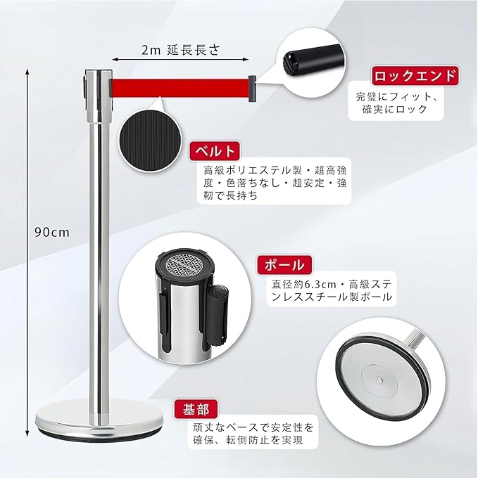 【赤ベルトで視認性UP、安全確保】:鮮やかなレッドベルトが視覚的なガイドとして効果的。歩行者や来場者に自然と注意を促し、事故防止やスムーズな誘導を実現します。暗い場所でも認識しやすく、安全性と効率性を高めます。