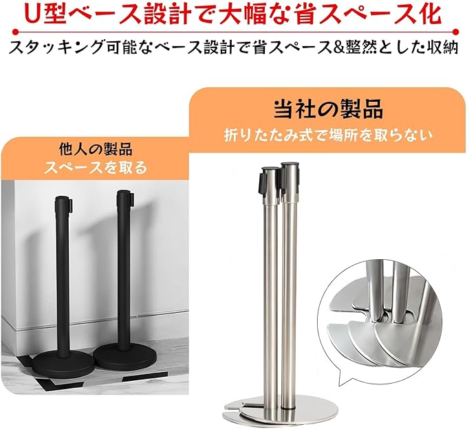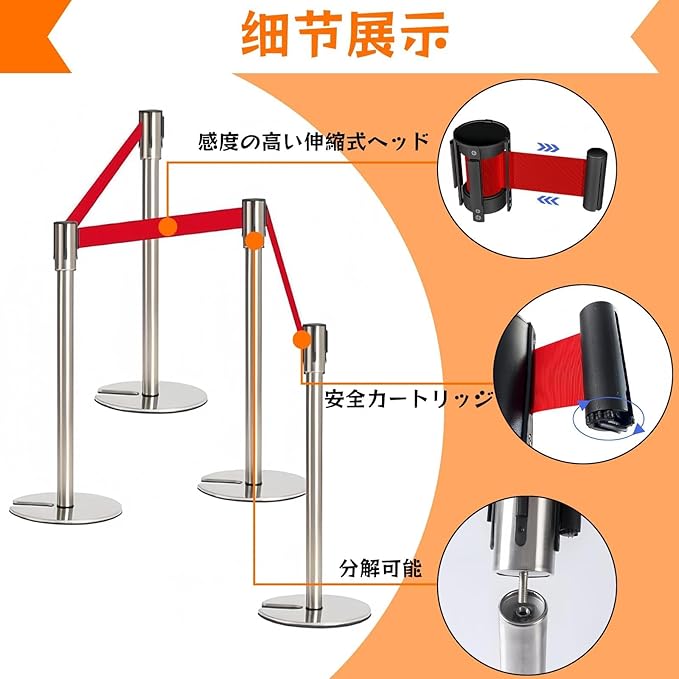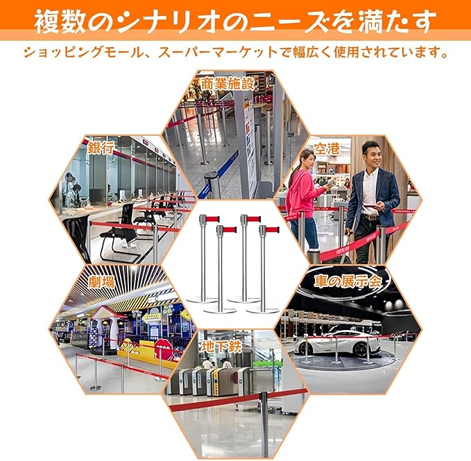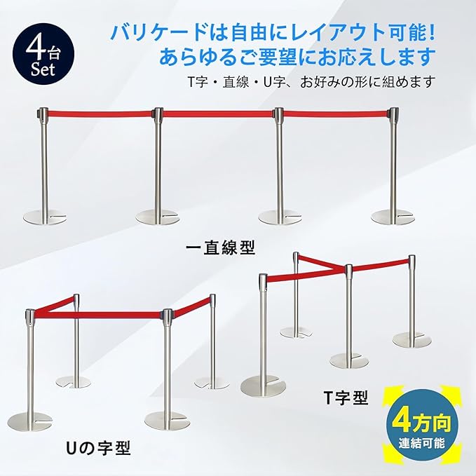 【カスタマイズ自在な4ベルト連結システム】:4本セットのベルトを前後左右に自由に連結可能。混雑時の人流整理、エリア分け、展示ブースの仕切りなど、様々なシチュエーションに柔軟に対応。単体でも複数連結でも使い勝手抜群で、効率的な空間管理を実現します。