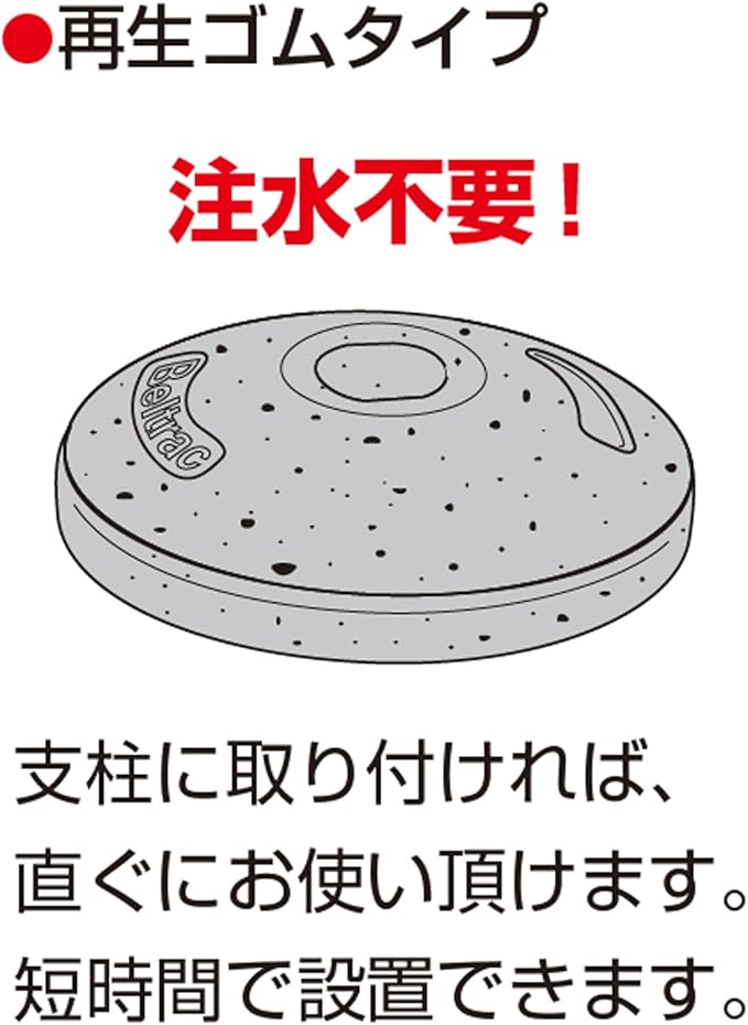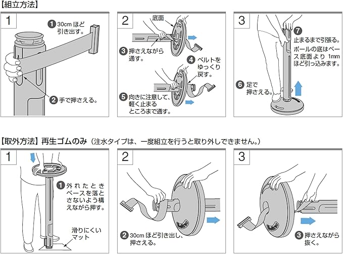 注意: 再生ゴムタイプは、長時間同じ場所に置かれると色移りする可能性があります。 注水タイプは、一度組立を行うと取り外しできません。 ベルト長さ以上に引っ張らないでください。 ベルトが濡れた状態で巻き取りし、長期保管すると巻き取りが悪くなる場合があります。