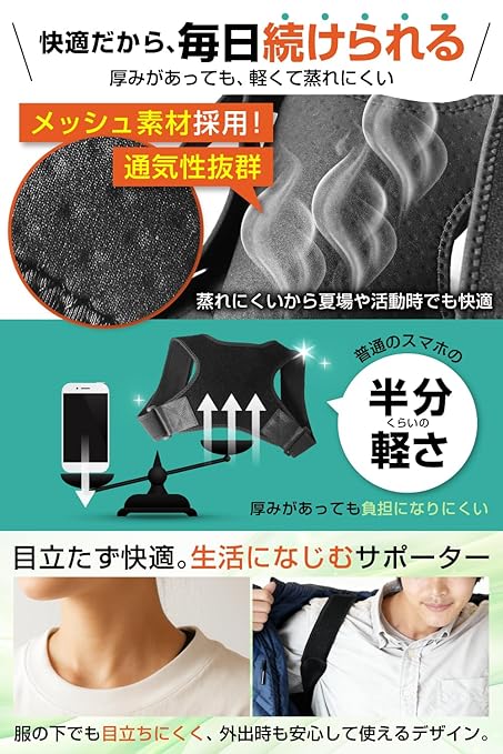 【Mサイズ・調整可能】 伸縮性のベルトで、標準的な体型にぴったりフィット。猫背や巻き肩が気になる方におすすめです。