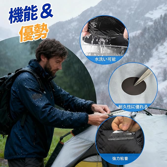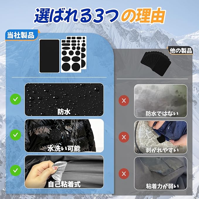 優れた防水性と耐久性:当社のダウン補修シートは、高い耐久性と優れた防水性が特長です。厳しい環境を想定した試験を重ねて開発されたため、雨や洗濯にも強く、長期間剥がれない信頼性を実現しています