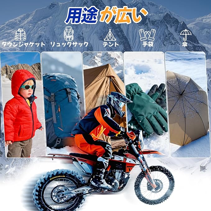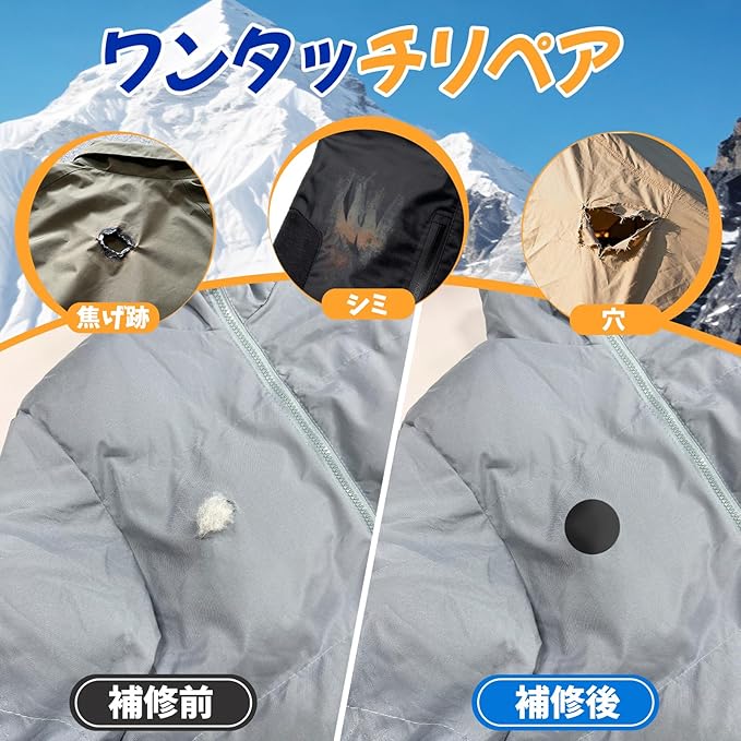 幅広い用途と創造的なDIY:ダウンジャケットはもちろん、傘、テント、リュックなど、様々な布製品の穴あき補修にご利用いただけます。アイロン接着不要で、ズボンや靴の破れも素早く補修できます