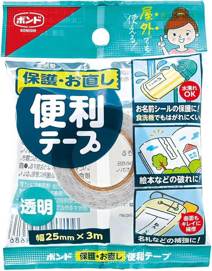【パック売り】コニシ ボンド #05868 保護・お直し 便利テープ 25mm 3M 2巻入り 透明 お名前シール 絵本 破れ補修 レインカバー補修 名札 おもちゃ・ベビー用品の補修 紙工作の製作 補強 緊急補修 耐水性 耐熱性