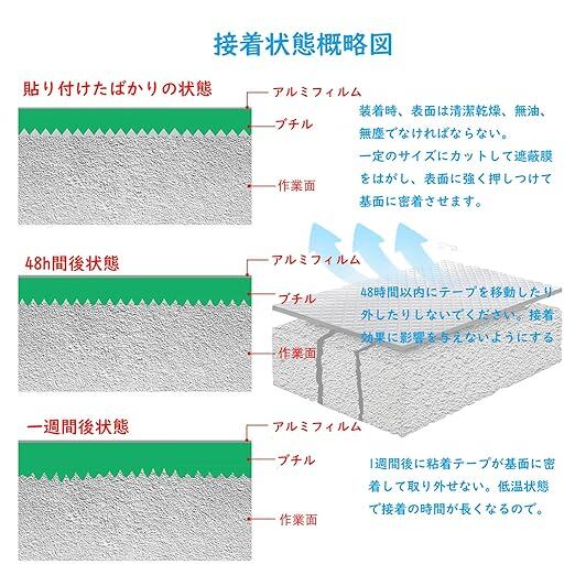 【グレードアップの復合耐水材料】ブチルテープ 防水は不織布と環境保護のブチルゴム制のアルミホイルでできており、防腐と老化防止の膜を加えて、ブチルテープは広范な働作温度范囲があります。極端な温度でとろけることはありません。80 C/176 Fでは割れずに2時間、-40 C/-41 Fでは割れずに使用できます。また紫外線やホコリなどの悪天候で長時間使用しても劣化や摩耗がありません。
