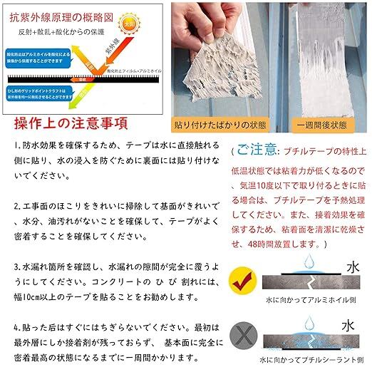 【操作上の注意事項】1.テープは水に直接触れる側に貼り、水の浸入を防ぐために裏面には貼り付けないでください。 2.コンクリートのひび割れには、はば幅10cmまたは15cmのテープをはる貼ることをおすすめ勧めします。 4.貼った后はすぐにはちぎらないでください。基本面に完全に密着最高の状態になるまでにー周間かかります。