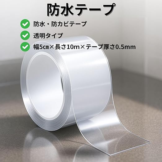 bath&bath 防水テープ 透明テープ 補修テープ 幅広 浴槽 キッチン 洗面台 コンロ周り 配管 防水 防カビ 汚れ防止 強粘着 (幅5cm 長さ10m テープ厚さ0.5mm)