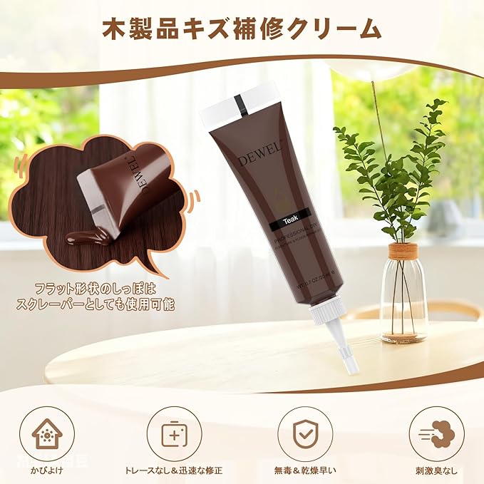 【楽でお金も節約】この木製品キズ補修クリームがあれば、専門業者に頼まず、自分だけでも補修できます。掃除の時も勝手に修正でき、楽でお金も節約でき、時間も節約できます。