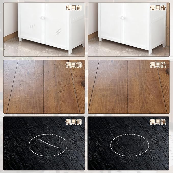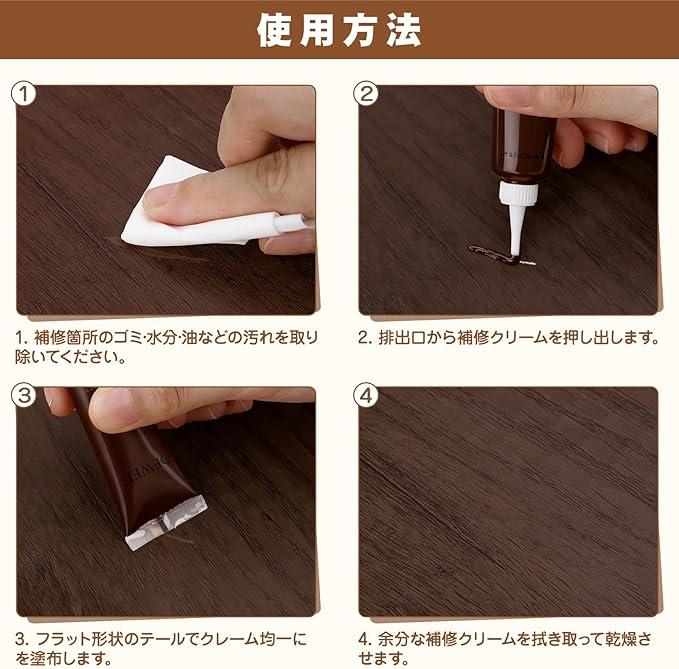 【使用方法】キズ所の汚れを取り除きます。補修クリームで穴を埋めてキズを補修します。余分な塗料を拭き取り、乾かす後、完成します。