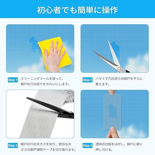 【フリーカット、貼り付けが簡単】網戸 補修テープの柔らかい材質は、サイズを自由に裁断でき、台紙を引き裂くと網戸に貼り付けることができて便利です。初心者でも簡単に利用でき、部屋の貸し出しにも使えます。