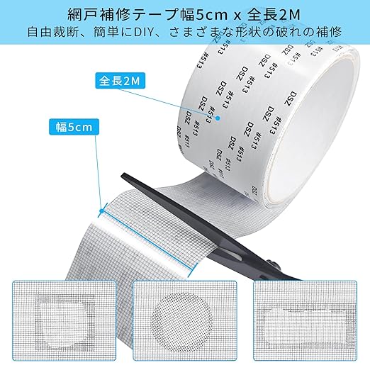 【セット内容】網戸補修テープ 1巻。サイズ:5cm 2m、厚み:0.3mm、カラー:ライトグレー、材質:ガラス繊維。網戸補修テープは安全無毒厚手ガラス繊維素材を採用、安心して使用。網戸 補修テープを使うと、網戸がきれいに明るく見えます。網戸の補修に最適!