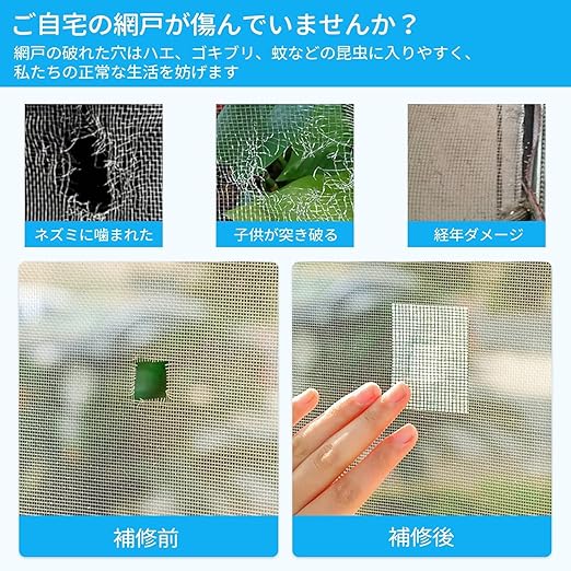 【用途広い、網戸 補修】網戸補修テープ 枠は室内や屋外に使用でき、網戸や網戸の破れを補修するのに最適です!網戸補修シートは網戸、蚊帳、キャンプテント、カーテンなどの補修に用。