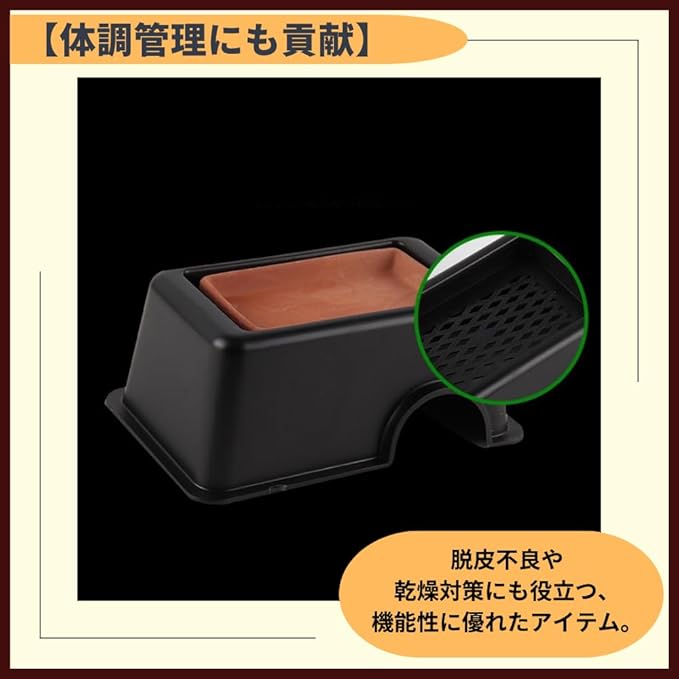 【湿度管理が簡単】水を注ぐだけで湿度調整完了。手間なく快適な飼育空間を実現。【ペットも安心】洞窟風シェルターがペットに安心感を与え、リラックス効果も◎。【インテリアにも馴染む】スタイリッシュなブラックカラーで、飼育ケースの見栄えも向上。【体調管理にも貢献】脱皮不良や乾燥対策にも役立つ、機能性に優れたアイテム。