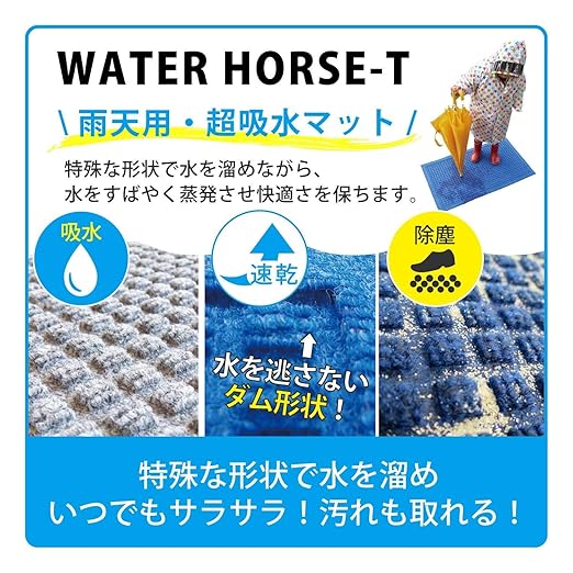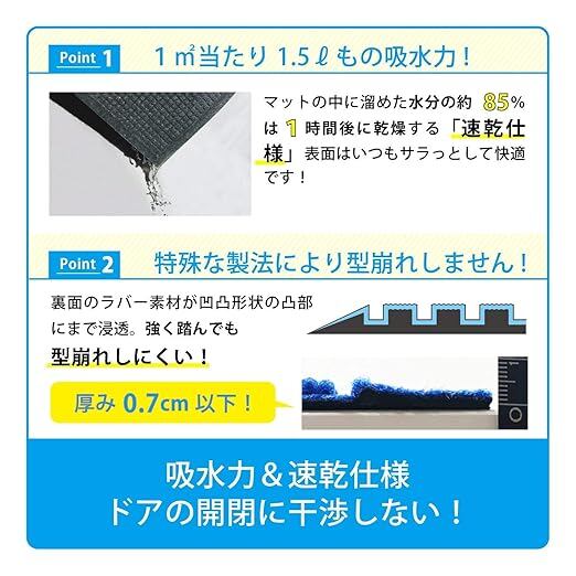 【機能】吸水・速乾仕様の雨の日に適した玄関マット。特殊な凹凸形状で水分を底に溜めながら素早く乾燥させて快適さを保ちます。1㎡あたり1.5リットルの水分を吸水し、靴底からキャッチした水分の約85%が1時間後には乾く速乾仕様です。またマットの縁(フチ)のダム構造が水分をマット周囲に零しません。*直接雨が掛からない軒下など屋根のある場所でお使いください。短期間で大量の水分を吸収したり雨が直接マットに掛かると本来の機能が発揮されません。