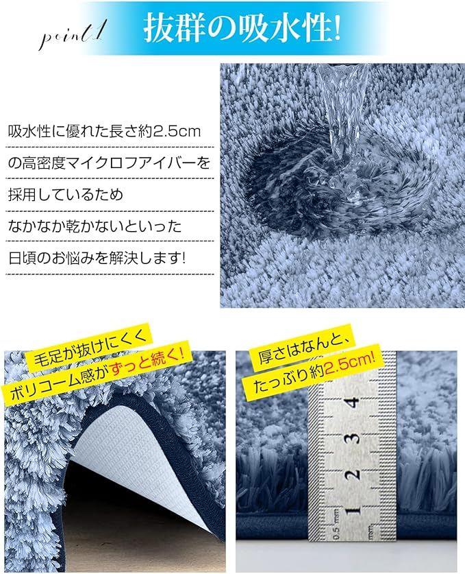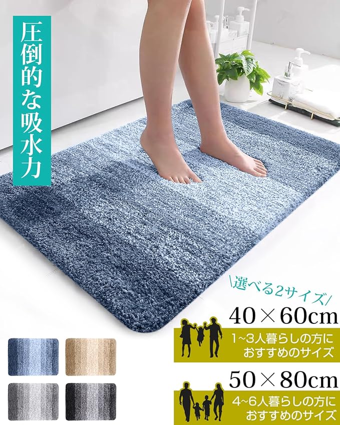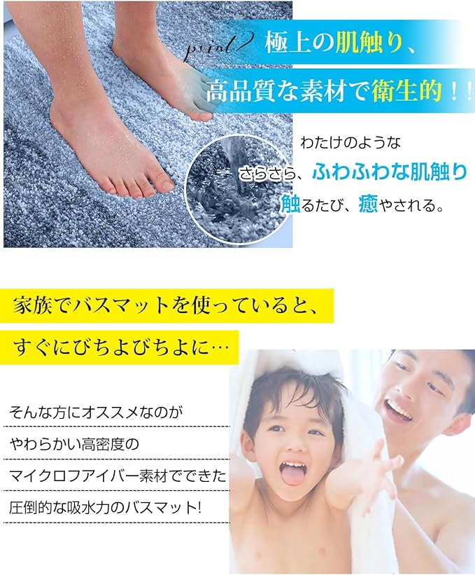 【吸水性 & 速乾性に優れている】 ふんわり優しい肌触りの極細マイクロフアイバーが水分をしっかり吸収します。トン・トン・トンと2、3回足踏みするだけで、圧倒的なスピードで水分を一気に吸い上げてくれます。速乾性も高いため、2人目3人目もビショビショしなくて、ふかふかであたたかい状態を維持してくれます 。