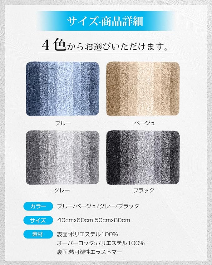 【丸洗いOK&お手入れカンタン】 丸洗えるため、ネットに入れて洗濯機に洗っていただきます。忙しい毎日でも、いつでも気軽に洗濯できます。部屋干しも天日干しもOKで、普段使いにピッタリの理想的なバスマットです。※漂白剤・乾燥機のご使用を避けることをおすすめしています。「仕様」サイズ:40*60cm;素材:表面がポリエステル100%で、オーバーロックがポリエステル100%で、裏面が熱可塑性エラストマーです。