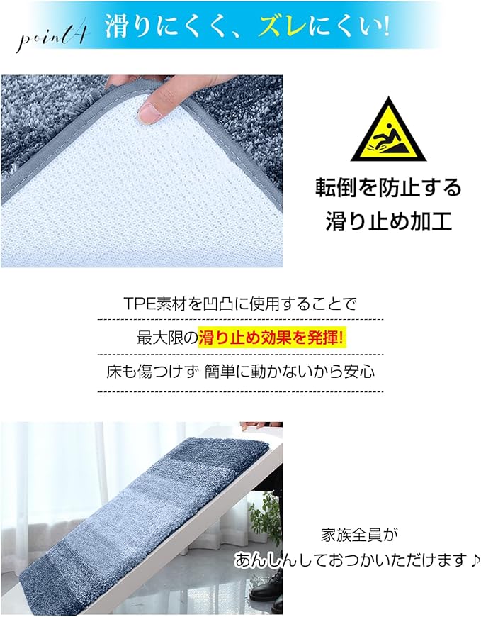 【滑り止め付きで安心】 裏面はTPE素材で、滑り止め加工が施されているのて足を乗せてもズレにくく、使用時にずれる心配がなく、安心してお使いいただけます。それに、しっかりとした丁寜な縫い上げて、毛足が抜けにくく、ポリューム感が持続します 。厚さをしっかりと感じられるバスマットで、踏み心地も抜群で、お風呂上がりも快適です。