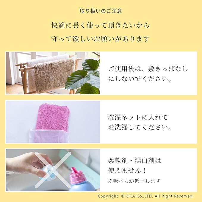 ●柔軟剤(吸水力が損なわれます)や漂白剤は、ご使用にならないでください。