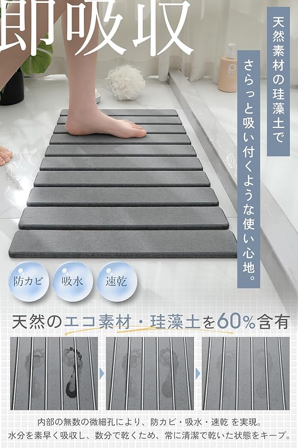 ✅ 【防カビ仕様でいつでも快適】 湿気のこもりやすい浴室環境でも快適に使える防カビ仕様。濡れた状態で放置してもイヤなニオイやカビが発生しにくく、常に清潔で爽やかな状態をキープ。頻繁に洗わなくても清潔感を保ちやすく、日々の手入れもラクな足拭きマットです。