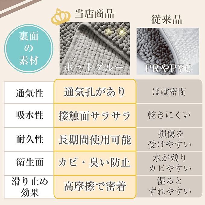 ✅【防水&滑り止め仕様・安全設計】 裏面には防水性の高い熱融着素材を採用。微粘性の滑り止め加工により、濡れた床でもしっかり密着しズレにくい構造。お年寄りやお子様のいるご家庭でも安心して使用できます。お風呂マット 速乾 滑り止め機能付きで、脱衣所・浴室・洗面台前に最適です。