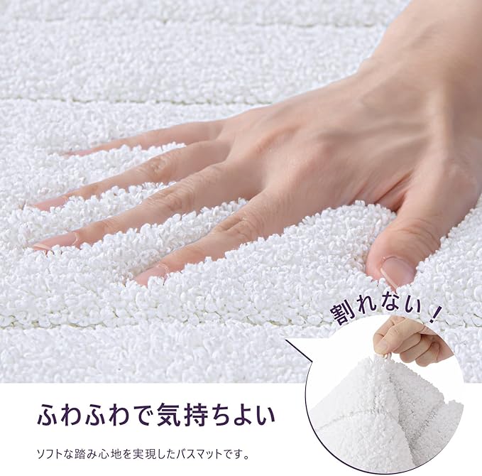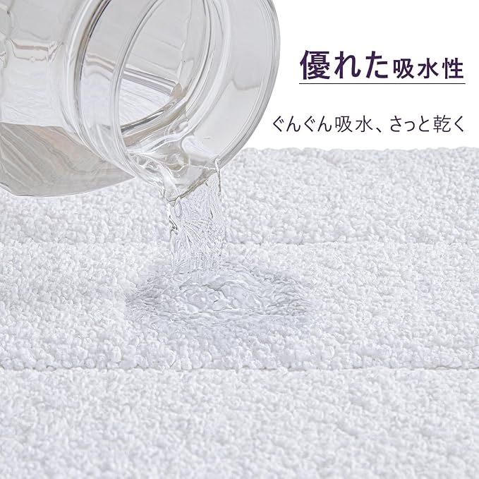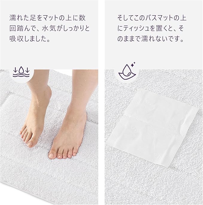 【濡れた足がすぐ乾燥】濃密で吸水力がいい繊維を加工し、水気をよく吸収します。びしょびしょな足をお風呂マットに包み込むと、すぐ水分を吸収します。いい乾燥さを与えます。足も、浴室のフロアも、よく乾く状態を保ちます。