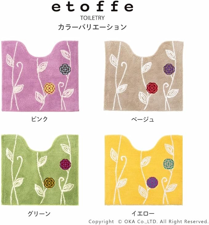 あたたかく、心地よく、自宅で過ごす時間がほんの少し、素敵になりそうなゆったりとした雰囲気のトイレマット「エトフ」。シンプルなマットに、のびやかな植物のツルお花をかたどったブローチのようなアップリケ。ナチュラルなモチーフをほんの少しモダンにデザインしました。マットは毛足は短め、目のつまったしっかりした踏み心地になっています。ゆったりと伸びたツルや葉はポリエステルとふんわりとしたやわらかな素材を使い、 細部までのこだわりが感じられます。 カラーは毎日にそっと彩りを添える、ピンクとベージュとグリーン、新たにイエローが追加された4色です。