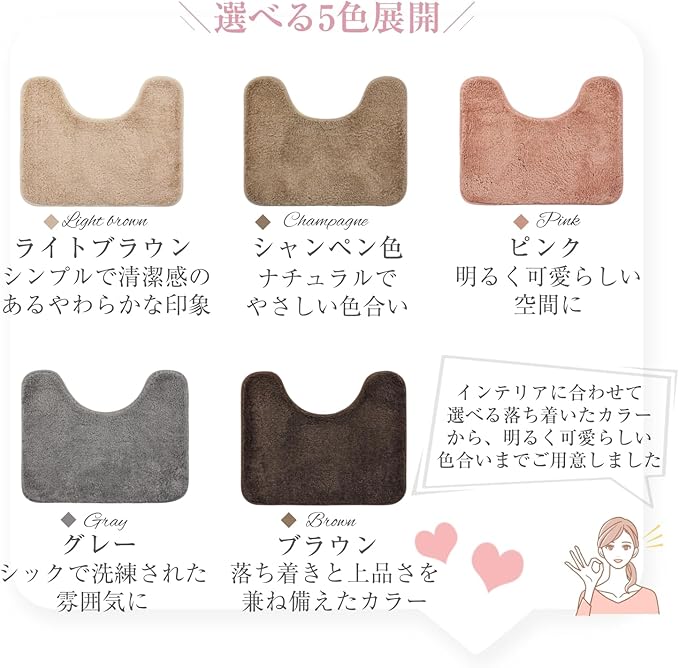 【豊富なカラーバリエーションで空間になじむ】 インテリアに合わせやすい落ち着いた色展開で、トイレマットが自然に空間に溶け込みます。中でも人気のトイレマット グレーは、シンプルなトイレインテリアにぴったりのカラーです。トイレ カーペットとしても違和感なくご使用いただけます。