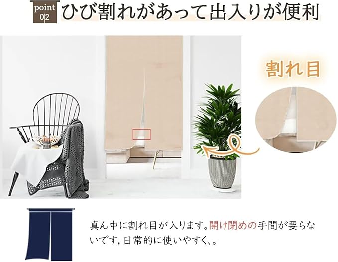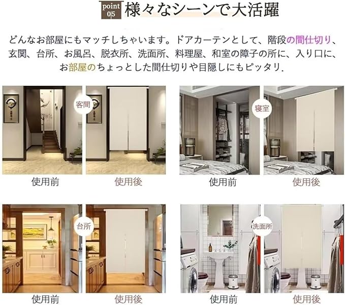 【使用シーン】厚手のしっかりした生地なので目隠しや間仕切りにもピッタリです。お部屋の入り口の間仕切り、和室、洋室、廊下、キッチン、子供部屋や玄関、窓など、様々な場所でご愛用いただけます。
