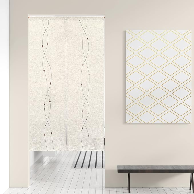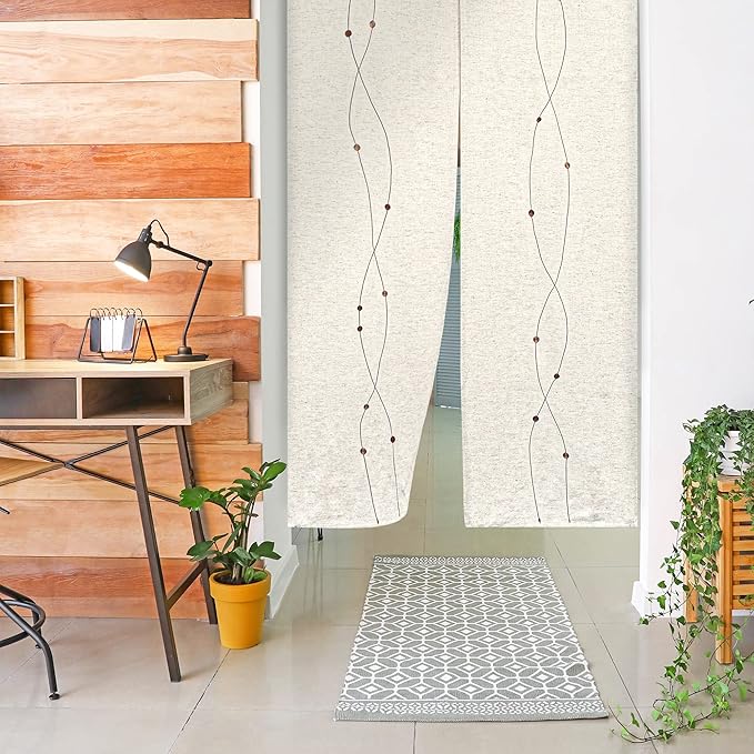 インド製のしなやかな綿を使った軽い風合いのシンプルな刺繍のれん。 ゆるやかな曲線を描く刺繍が上質さを感じさせ、おしゃれな空間作りに最適。軽やかで優しく、ふんわりとしたやわらかい手触りだから、体当たりもストレスフリー。洋風はもちろん和風にも合わせやすいので様々なテイストのお部屋にお使いいただけます。