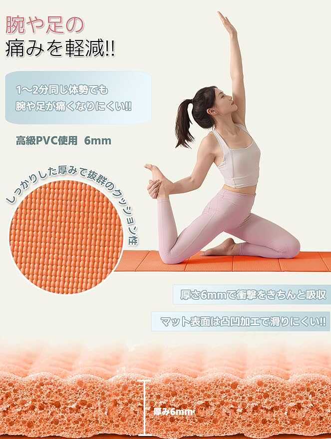 【軽いのに6mmの適度なクッション性】関節への負担を軽減! 厚みがあるのに軽量設計で、持ち運びが楽。6mmの適度な厚みがひざやひじ、腰への衝撃を和らげ、快適なエクササイズを実現します。長時間の使用も疲れにくい。
