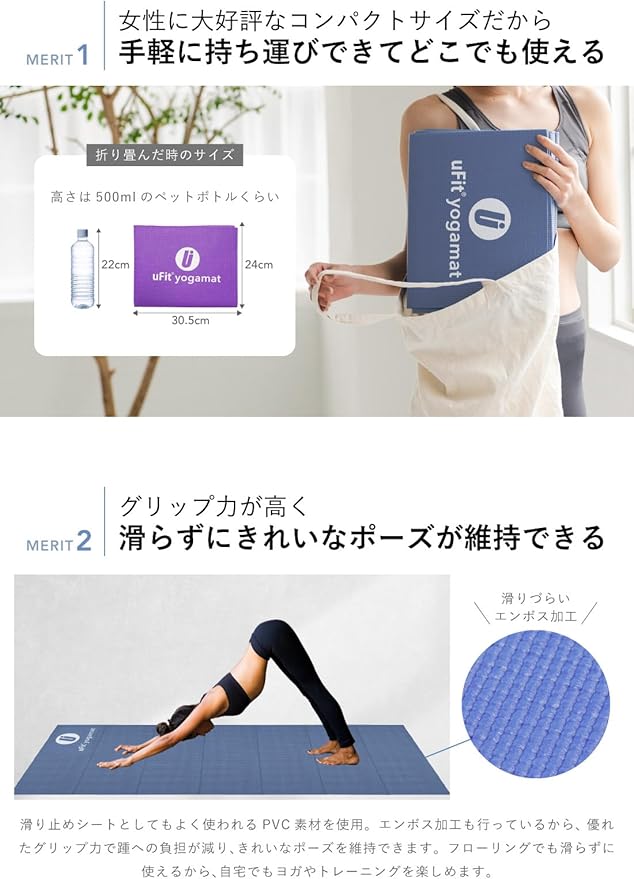 【折りたたんで持ち運べるコンパクトさ】uFit Yoga Matは、折りたたんで持ち運べるコンパクトで女性に嬉しいヨガマットです。折りたたんだときのサイズは、縦24cm、横30.5cm、高さ5.6cmです(※厚さ4mmの場合)。