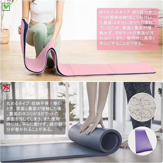 ❤【5秒簡単収納、省スペース&持ち運びに便利な折りたたみヨガマット】普通の丸めて収納するタイプと異なって、折りたたみヨガマットは持ち運びや収納にもっと便利!ヨガマット折り目ラインで様々なポーズをチェックできて便利!折り目があるのでセンターラインもわかり,手や足を置く位置の目安になり正しい姿勢を維持しやすい!いつもきれいなポーズを保てます。収納袋が付き、背負っていると目立たないし邪魔もしないです。本のような形なので、バッグにいれてどこでも持てます。ピクニックマット、キャンプマット、昼寝マット、トレーニング器具の保護マットとしても使えます。