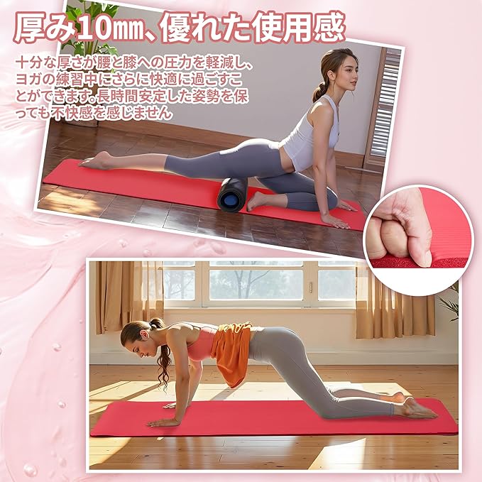 VECELO ヨガマット 10mm厚 手首・膝を守る高弾性マット 滑り止め加工・防音・水洗い可能 ピラティス/筋トレ/ストレッチ用 軽量バンド付き 183 61cm