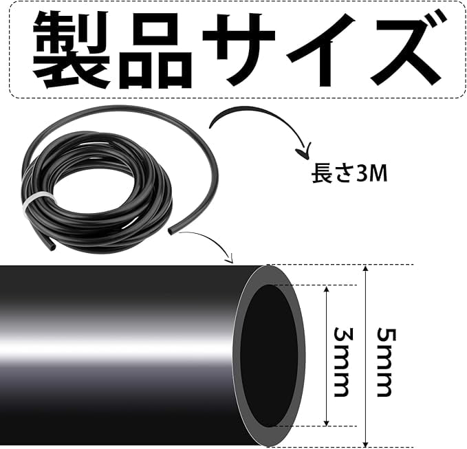サイズ:内径3mm 外径5mm 総長3m チェーンソー燃料タンクスペアパーツブラックオイルパイプ。