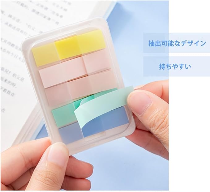素材:丈夫で破れにくい、フィルム素材の付箋。貼ると透明になるので、下の文字や絵を隠さず読める。