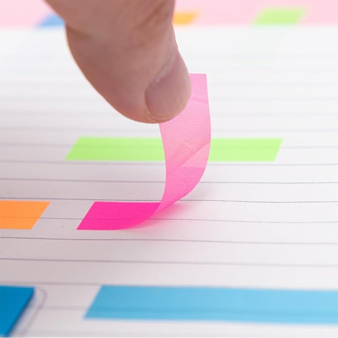"サイズ:45 12mm カラー:カラフル 数量:5色各20枚 2部 素材:丈夫で破れにくい、フィルム素材の付箋。貼ると透明になるので、下の文字や絵を隠さず読める。 分類:カラフルな5色のセットなので、色で識別したり、書いた部分を目立たせたりすることができる。"