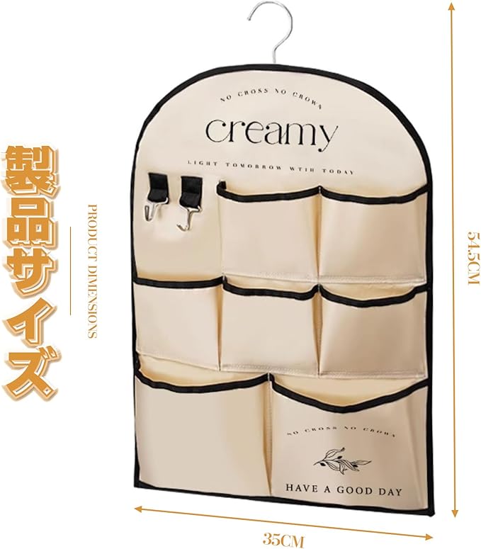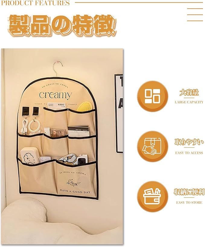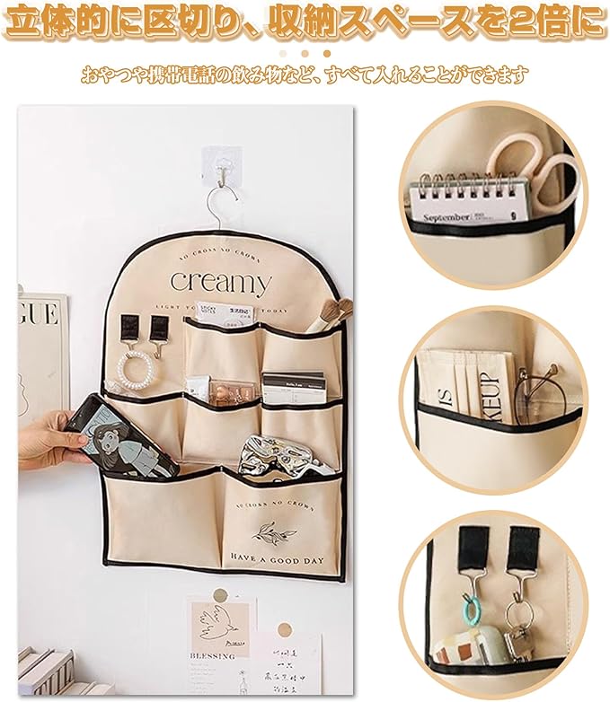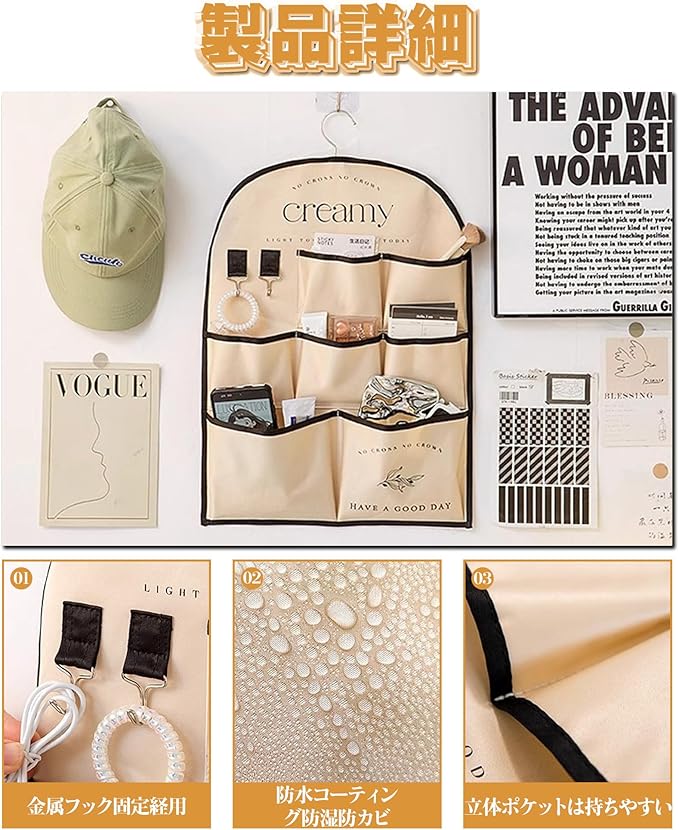 この商品は、3段7ポケットの階層構造を持つ吊り下げ式のウォールポケットです。各ポケットのサイズや角度が考慮され、新聞紙や雑誌、封書からリモコンや文房具まで、多種多様なアイテムを分類収納できます。