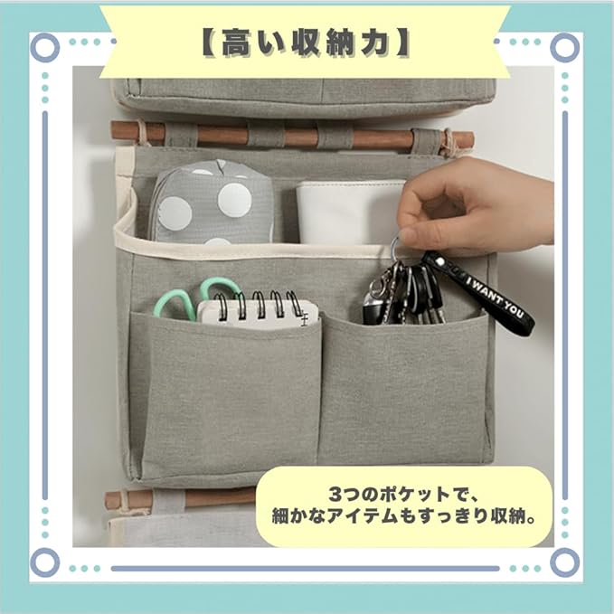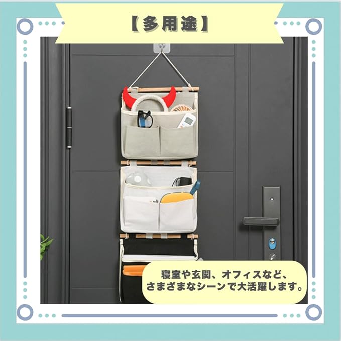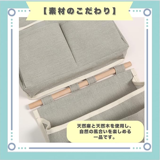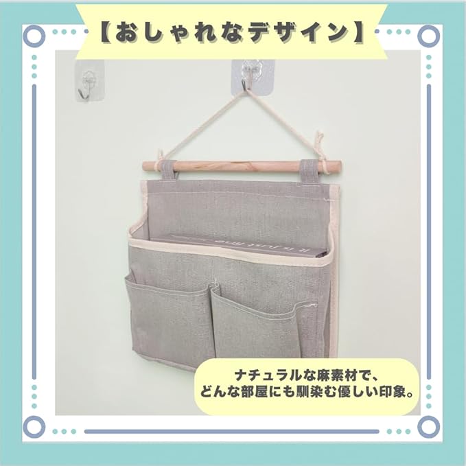 【おしゃれなデザイン】ナチュラルな麻素材で、どんな部屋にも馴染む優しい印象。【素材のこだわり】天然麻と天然木を使用し、自然の風合いを楽しめる一品です。【高い収納力】3つのポケットで、細かなアイテムもすっきり収納。【多用途】寝室や玄関、オフィスなど、さまざまなシーンで大活躍します。