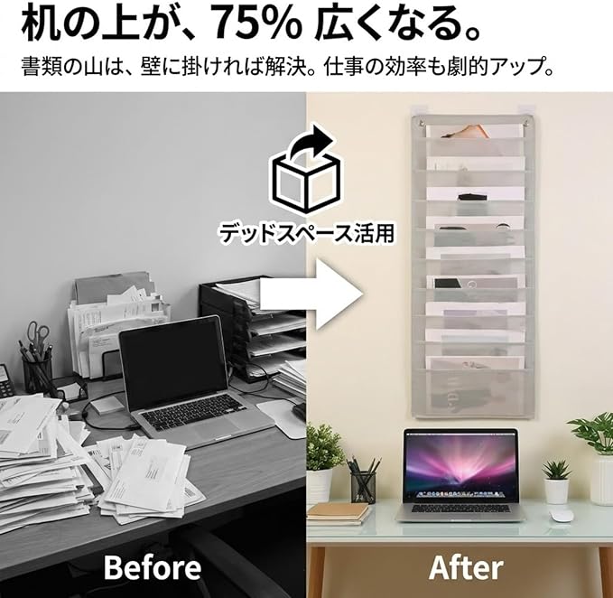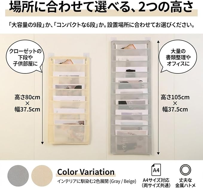 【用途に合わせてスッキリ収納】 設置場所や収納量に合わせて「6ポケット(高さ80cm)」と「9ポケット(高さ105cm)」の2タイプからお選びいただけます。デスク横や狭いスペースにはコンパクトな6段、大量の書類や家族分の仕分けには大容量の9段がおすすめです。壁面を活用することで、デスク上のスペースを節約できます 。