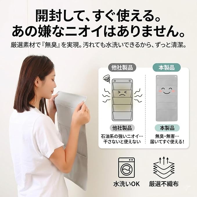 【届いてすぐ使える!ニオイの心配なし】 厳選された不織布素材を使用しており、開封直後の独特な化学臭や不快なニオイがありません。「風通しをしてから使う」という手間がなく、届いたその日から快適にご使用いただけます。万が一汚れても水洗いが可能なため、キッチンや洗面所周りでも安心です 。